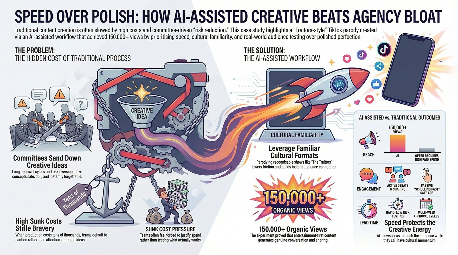 Today's platforms reward speed, cultural fluency, and the guts to say something interesting. Yet most creative processes still prioritise committee consensus over actual audience response.